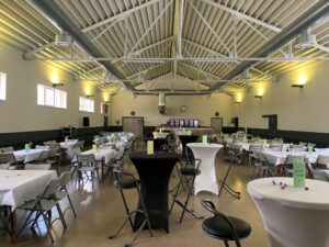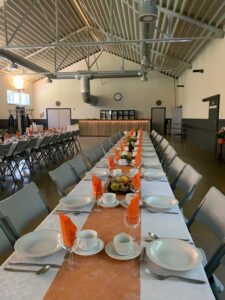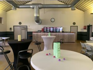 (Staan)tafels, stoelen, borden, glazen en bestek zijn aanwezig.